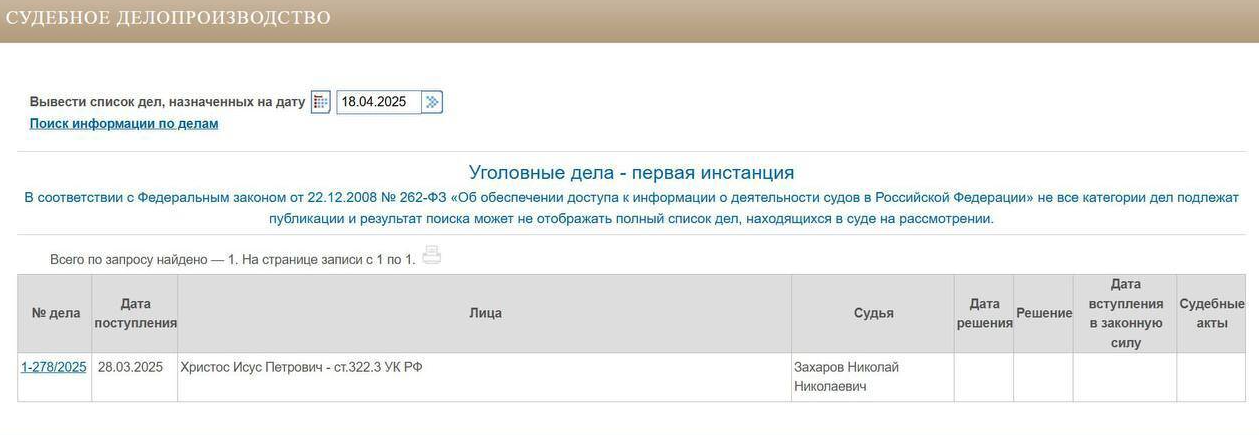 В столичном районном суде РФ рассматривается дело против гражданина России, по имени Иисус Петрович Христос. Его обвиняют в фиктивной регистрации 45 мигрантов в собственной однокомнатной квартире.